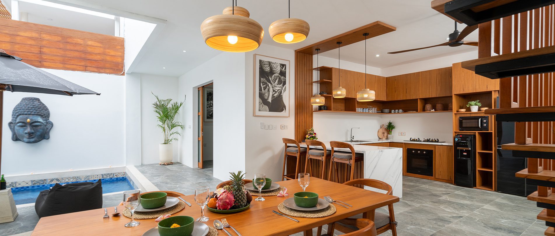 Beautifully furnished with a solid wooden Dining table that can seat up to six with ease, or relax on the L shaped sofa and zone out while watching the Smart TV in the living room. The dining area is designed for relaxed entertaining overlooking the pool with plenty of natural light pouring into the villa’s airy open plan layout. These areas are cooled with ceiling fans. The Kitchen is equipped with sleek black appliances to bring out the budding chef in any guest complete with complimentary bottled water. For those that want nothing more than a Balinese sunset, head upstairs